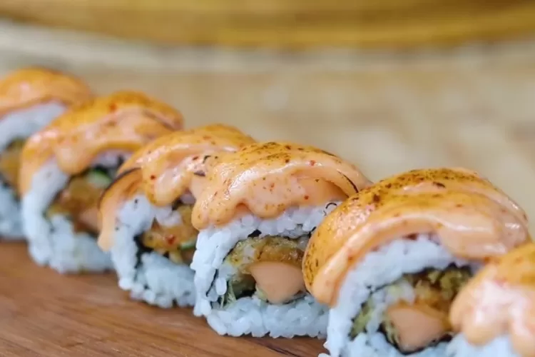 – Selanjutnya, torch sushi sebentar, beri saus mentai dan kremesan di atasnya.